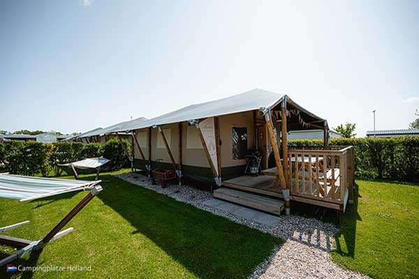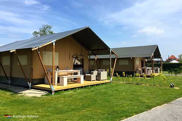 Die sehenswerten Safarizelte befinden sich ganz zentral auf dem Campingplatz und kombinieren das echte Campinggefühl mit dem Luxus eines Ferienhauses. Komplett eingerichtet mit zwei Schlafzimmern, einem Küchenblock und Lounge-Set auf der Veranda.